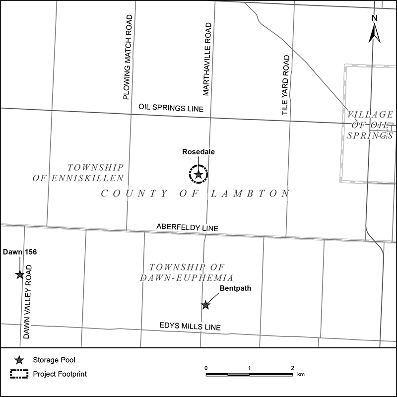 Enbridge Gas Inc. is applying to the Ontario Energy Board (OEB) pursuant to section 38(1) of the Ontario Energy Board Act, 1998 (OEB Act) for an order or orders granting approval to increase the Maximum Operating Pressure (MOP) of its Dawn 156, Bentpath and Rosedale Storage Pools. New infrastructure required for the project includes an injection and withdrawal natural gas storage well at the Rosedale Storage Pool, and approximately 100 m of 10-inch lateral natural gas pipeline, which will be constructed from the new well to the existing Rosedale Storage Pool gathering line. All infrastructure is located in the County of Lambton, the Township of Enniskillen and the Township of Dawn-Euphemia.